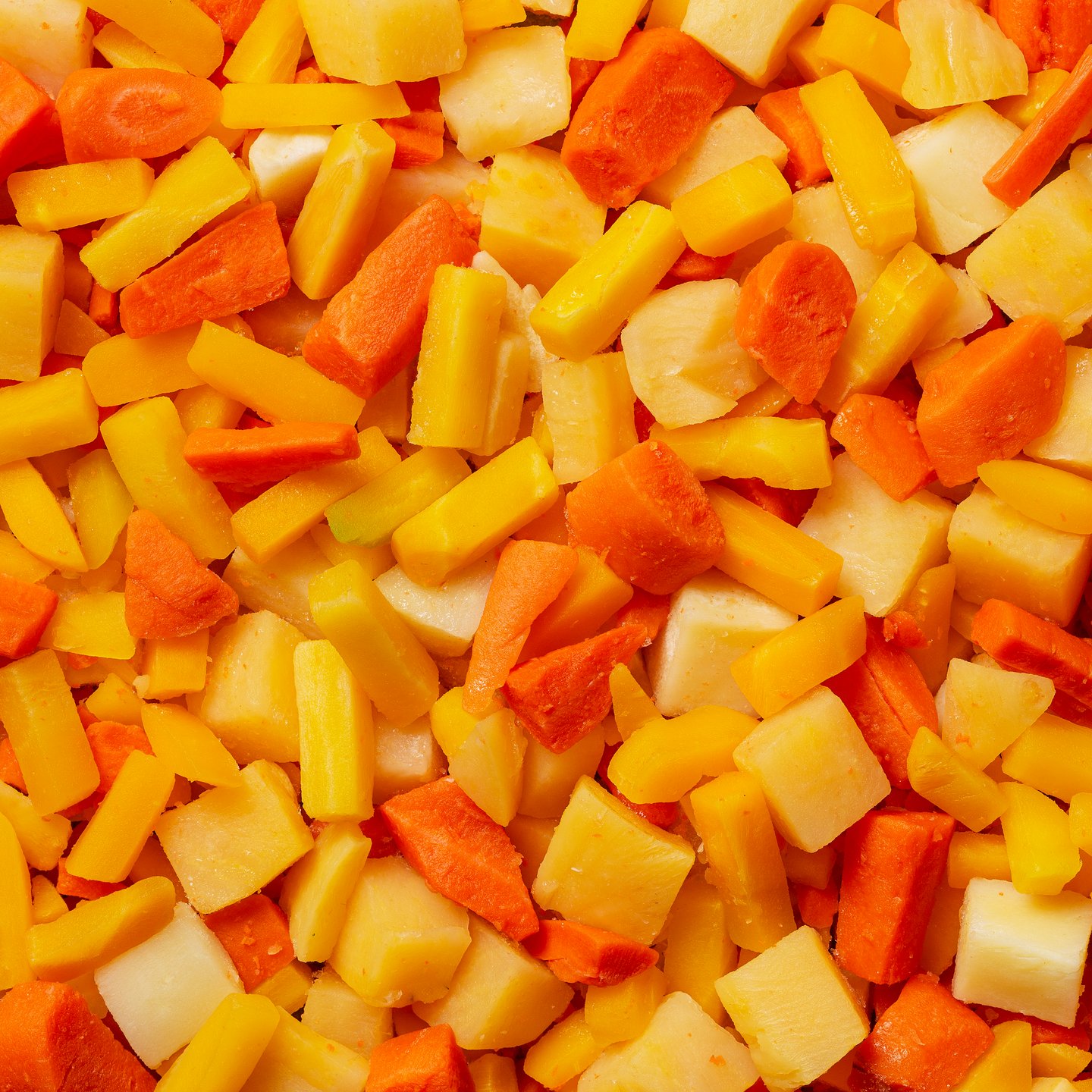 kuutioitu porkkana (40%), kuutioitu SELLERI (35%), kuutioitu palsternakka (15%), leikattu purjo (10%)