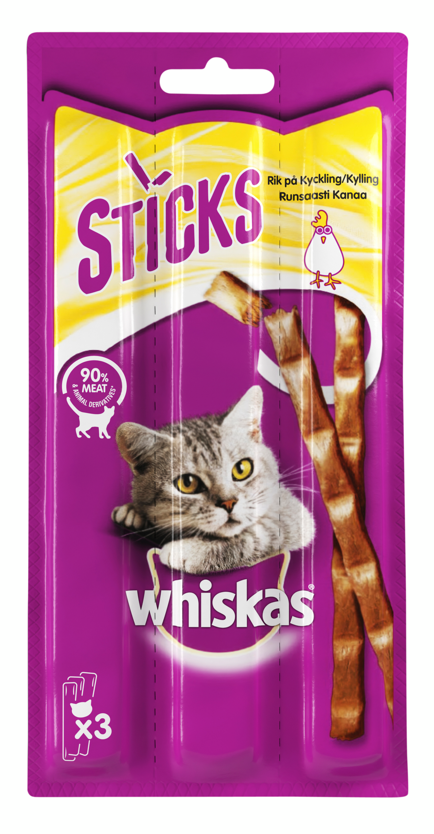 Whiskas® Sticks on herkullinen, lihaisa kissan makupala, sen jokainen pala sisältää 80% maistuvaa lihaa – mainio välipala. 3x6 g