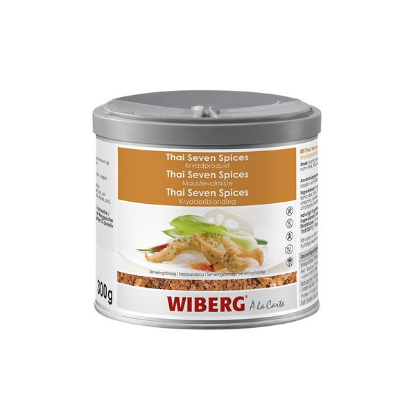 VegaaninenWiberg Thai Seven Spices maustevalmiste. Maistuu voimakkaasti chililtä, korianterilta, roomankuminalta ja valkosipulilta, raikas inkiväärin ja sitruunaheinän maku. Sopii erinomaisesti wokkiruokiin, kastikkeisiin, keittoihin ja salaatteihin. WIBERG-aromisuoja säilyttää valikoitujen raaka-aineiden aromit varastoinnin aikana, eikä arvokkaita haihtuvia öljyjä menetetä.