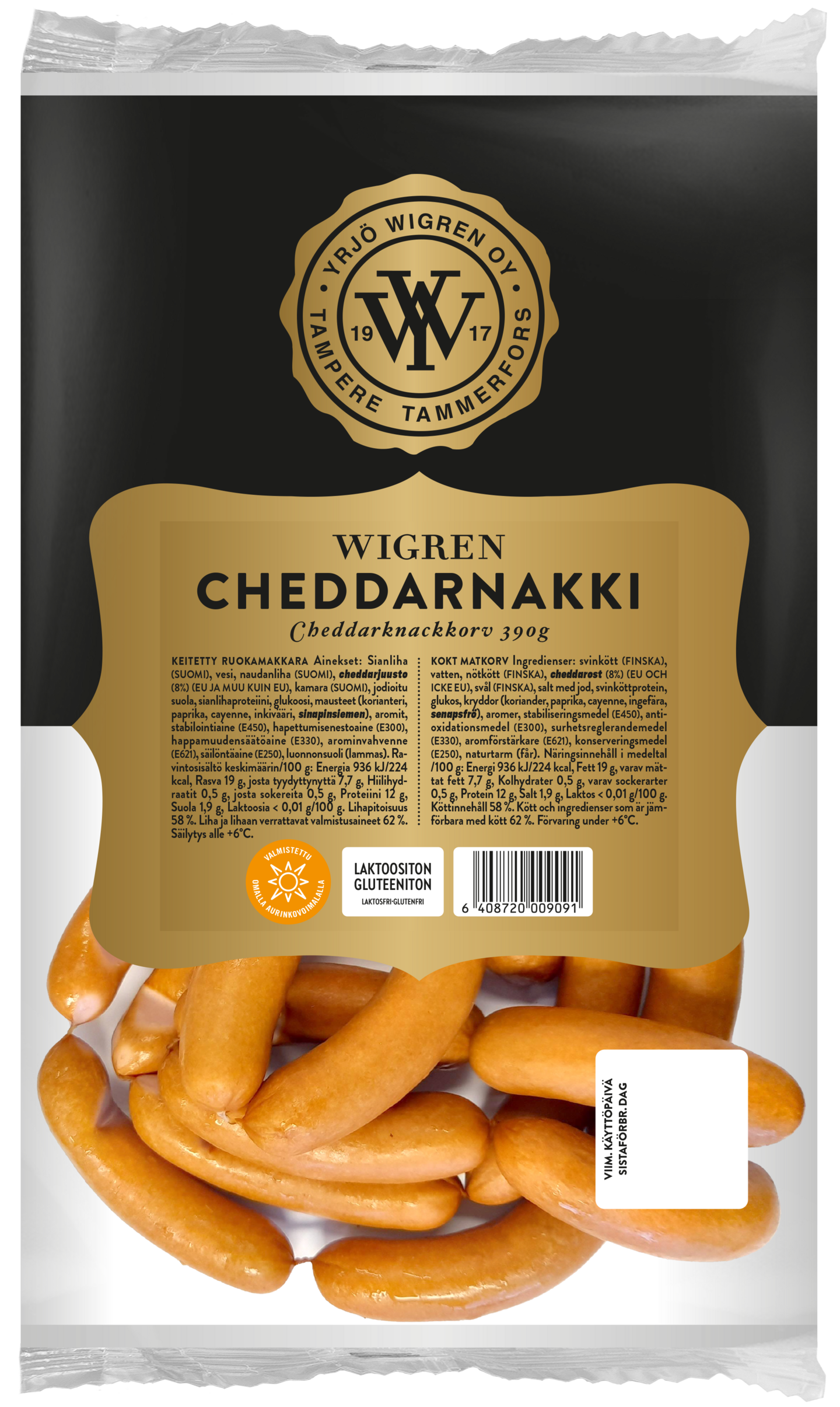Sianliha (Suomi), vesi, naudanliha (Suomi), CHEDDARJUUSTO (8%) (Eu ja muu kuin Eu), kamara, jodioitu suola, sianlihaproteiini, dekstroosi, mausteet (korianteri, paprika, cayenne, inkivääri, SINAPINSIEMEN) aromit, stabilointiaine (E450), hapettumisenestoaine (E300), happamuudensäätöaine (E330), arominvahvenne (E621), säilöntäaine (E250), luonnonsuoli (lammas)