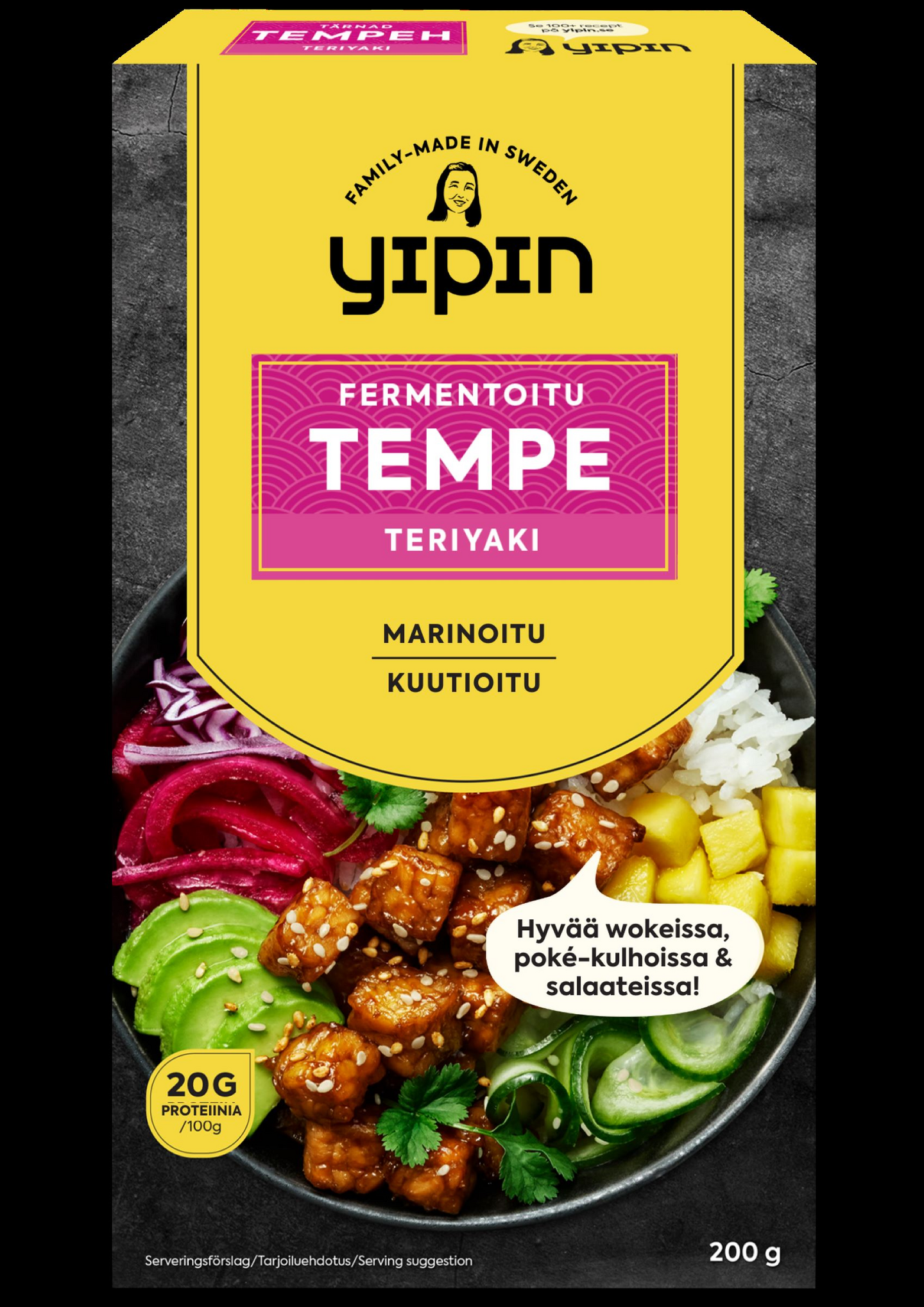 Maukas uutuus! Tempe teriyaki on marinoitu soijakastikkeella, valkosipulilla, inkiväärillä ja siirapilla ja sisältää huikeat 20 g proteiinia*. Se on valmistettu fermentoiduista soijapavuista, joten siinä on runsaasti ravintoaineita, kuten proteiineja, rautaa ja kuituja. Lisäksi se on hyvää vatsalle. Kiinteän ja mehukkaan koostumuksensa ansiosta se on myös todella helppo valmistaa; sinun tarvitsee vain paistaa valmiiksi kuutioitu tempe öljyssä – tai voit myös syödä kylmänä sellaisenaan.