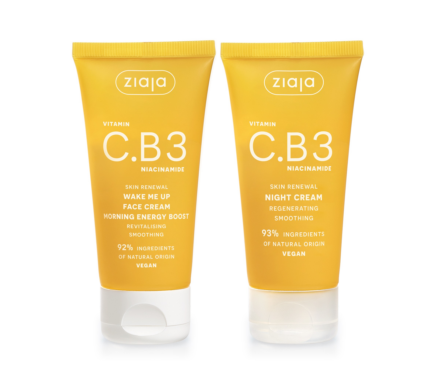 Ziaja C.B3-vitamiini päivä- ja yövoiteet sisältävät C-vitamiinia ja naisiiniamidia (B3-vitamiinia), jotka silottavat ihoa ja parantavat sen sävyä antaen iholle kauniin hehkun. Tuotteet tekevät ihosta välittömästi heleämmän, virkeämmän ja uudistuneen näköisen. Kaikille ihotyypeille, erityisesti: kuivalle, samealle, ikääntyvälle, pigmenttimuutoksiin, ruusufinniin, rasvoittuvalle tai akneneiholle. Tuotteet on testattu ihotautilääkärin valvonnassa.