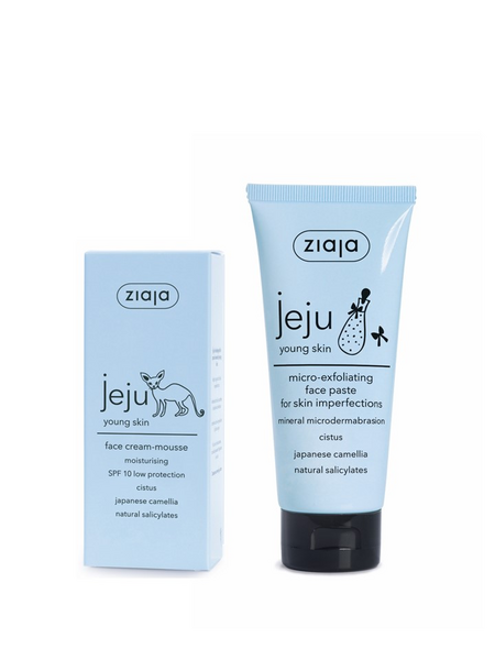 Korealaisesta kosmetiikasta inspiroitunut ja laadukkaita aasialaisia ainesosia sisältävä Jeju on kehitetty nuoren ihon erityistarpeisiin. Nuori iho rasvoittuu ja kuivuu usein samaan aikaan. Jeju puhdistaa, hillitsee rasvoittumista ja epäpuhtauksia sekä tehokosteuttaa ja rauhoittaa ihoa. Jeju parantaa todistetusti ihon kosteuspitoisuutta ja vähentää tukkeumia jopa 68 %. Tekee ihosta terveen näköisen ja pehmeän tuntuisen. Myös aikuisen hormoninäppyjen hoitoon. Raikas mintun, mustaherukan ja granaattiomenan tuoksu. Jeju moussemainen kasvovoide 50ml + mikrokuorinta 75 ml. Luonnolliset salisylaatit vähentävät epäpuhtauksia. Kistusuute rauhoittaa ja kameliaöljy kosteuttaa ihoa. Vähentää punoitusta. Vegaaninen. Kasvovoiteen käyttö: Levitä kasvojen iholle. Vältä silmänympärysihoa. Kuorinnan käyttö: Levitä kasvoille ja pese vedellä pyörivin liikkein. Huuhtele huolellisesti. Vältä silmänympärysihoa. Vegaaninen.
