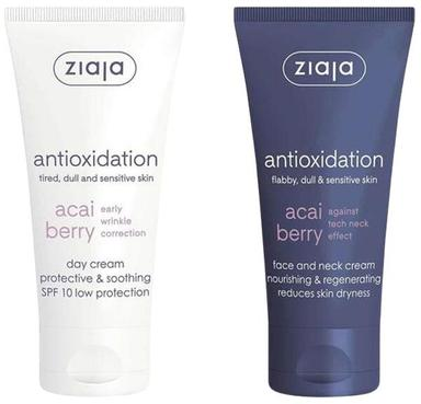 Antioksidanttinen Ziaja Acai Berry suojaava ja rauhoittava päivävoide SK 10 ja uudistava yövoide väsyneelle, elottomalle ja herkälle iholle. Sopii monen ikäiselle, sekä nuorelle aikuiselle että ikääntyvälle iholle. Virkistävä päivävoide taistelee ikääntymisen ensimerkkejä, älylaitteiden käytön aiheuttamia kaulajuonteita sekä ilmansaasteita vastaan. Brasilialainen superfood Acai-marja sisältää runsaasti antioksidantteja, jotka suojaavat ihoa ennenaikaista ikääntymistä aiheuttavilta vapailta radikaaleilta. Hyaluronihappo kosteuttaa ja silottaa ihoa. Sheavoi pehmentää ihoa tehokkaasti. Beetaglukaani vähentää ihoärsytyksiä ja rauhoittaa punoitusta. Ihosta tulee luonnollisen hehkuva ja terveen näköinen. Raikas marjaisa tuoksu antaa virkistävän tunteen. Vegaaninen. Testattu ihotautilääkärin valvonnassa.